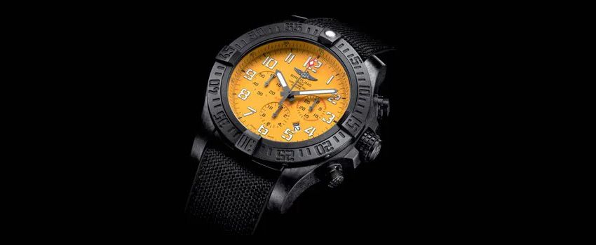 The Brietling Avenger Hurricane 12H – in yellow – features an even larger 50mm dial that makes it a watch that’s not suited to the thin-wristed. Powered by Brietling’s in-house Manufacture 01 movement, the watch has a power reserve of 70-hours, and the case is constructed from ultra-light and ultra-rugged Brietlight material. To enhance the watches’ usability, the dial features large numerals in a stencil-type design. It also has a non-slip treatment on the crown and push pieces for ease of use even when wearing gloves.